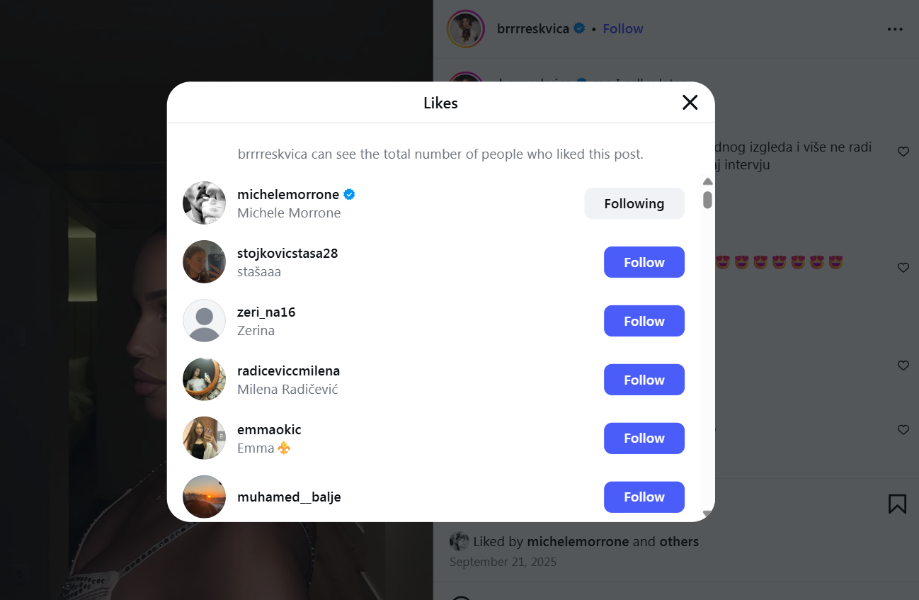 Но, додека жените буквално го „ловат“ низ Белград, вниманието на Мороне очигледно е насочено кон младата пејачка Анѓела Игњатовиќ – Бресквица. Имено, актерот ја следи Бресквица на социјалните мрежи и, според она што може да се види, редовно ѝ ги лајкува речиси сите објави.