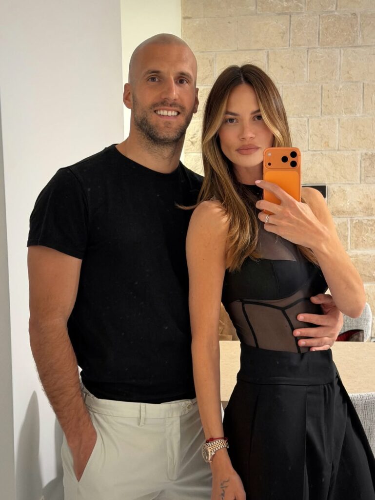 Таа позираше во проѕирна маичка и црни панталони, додека нејзиниот сопруг Јеврем ја прегрнува околу половината.