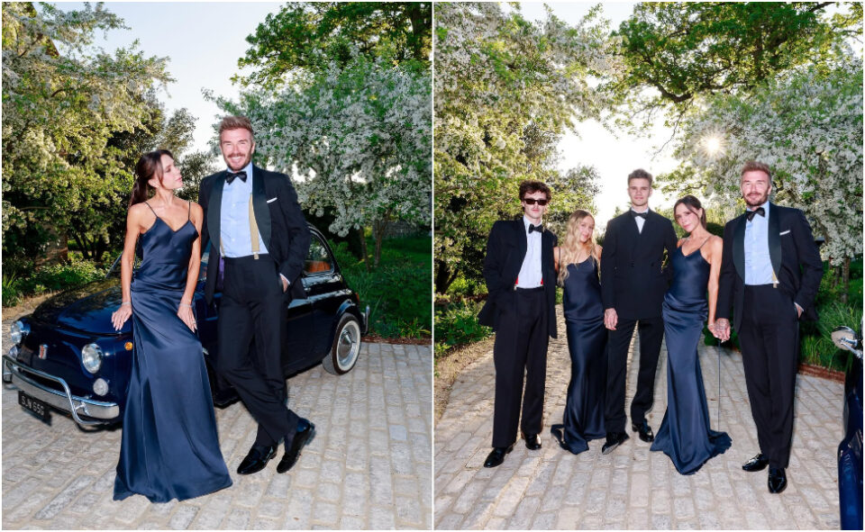 На фотографиите, Викторија и нивната ќерка Харпер, која има 13 години, носат исти темносини свилени фустани, а Дејвид, Ромео (22) и Круз (20) се облечени во црни свечени одела. На неколку слики, тие позираат пред автомобил, а на една Дејвид нежно ја бакнува Харпер во чело.