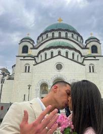 Таа позираше со својот сопруг пред Храмот „Свети Сава“, а во еден момент може да се види како младенците ја сечат тортата.