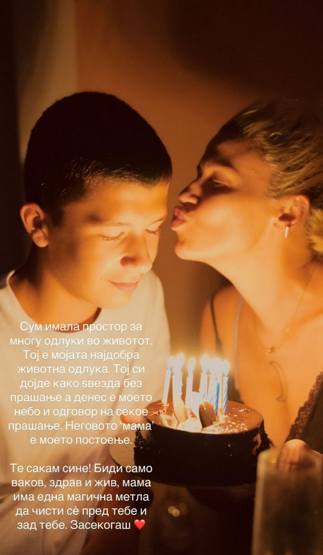 „Сум имала простор за многу одлуки во животот. Тој е мојата најдобра животна одлука. Тој си дојде како ѕвезда без прашање, а денес е моето небо и одговор на секое прашање. Неговото ‘мама’ е моето постоење. Те сакам сине! Биди само ваков, здрав и жив, мама има една магична метла да чисти сè пред тебе и зад тебе. Засекогаш“, напиша таа.
