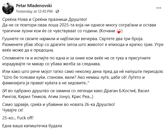Само здравје, среќа и убавини во новата 26-ка Друштво! Чувајте се! Една ваша капиштечка будала“, напиша Младеновски. Неговиот татко Никола, почина на 25 декември.