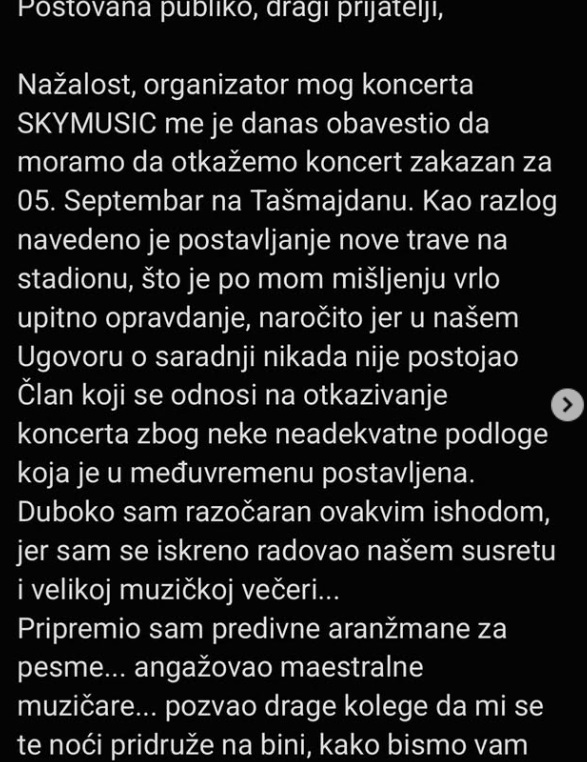 „Драга публико, драги пријатели, за жал, организаторот на мојот концерт денес ме извести дека мора да го откажеме концертот закажан за 5 септември на Ташмајдан. Наведената причина беше поставување нова трева на стадионот, што според мене е многу сомнително оправдување, особено затоа што нашиот договор за соработка никогаш немаше член во врска со откажување на концерт поради некоја несоодветна површина што беше поставена во меѓувреме.