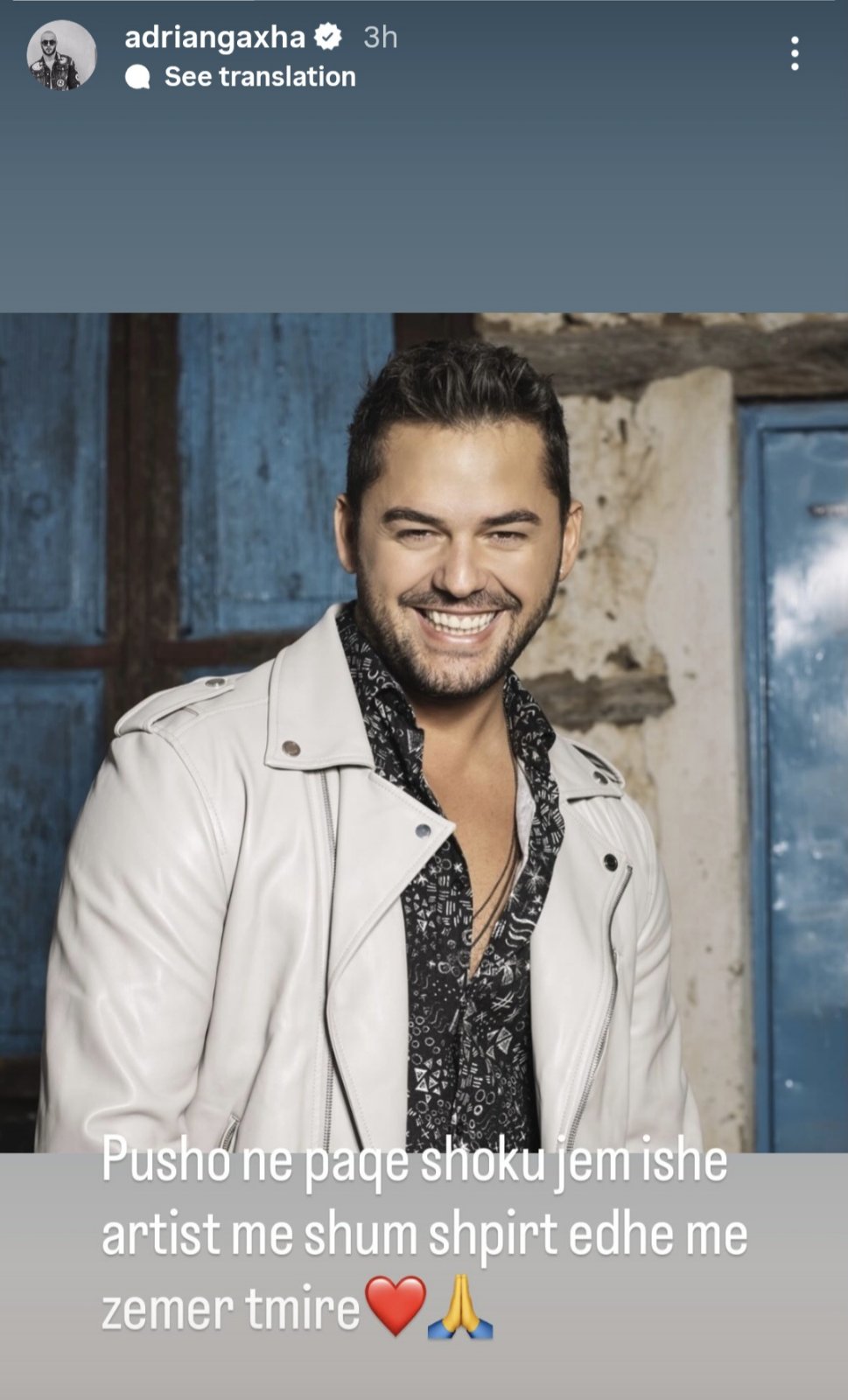 Пејачот Адриан Гаџа е скршен од болка до загубата на драга личност, од која се прости на неговиот инстаграм-профил.