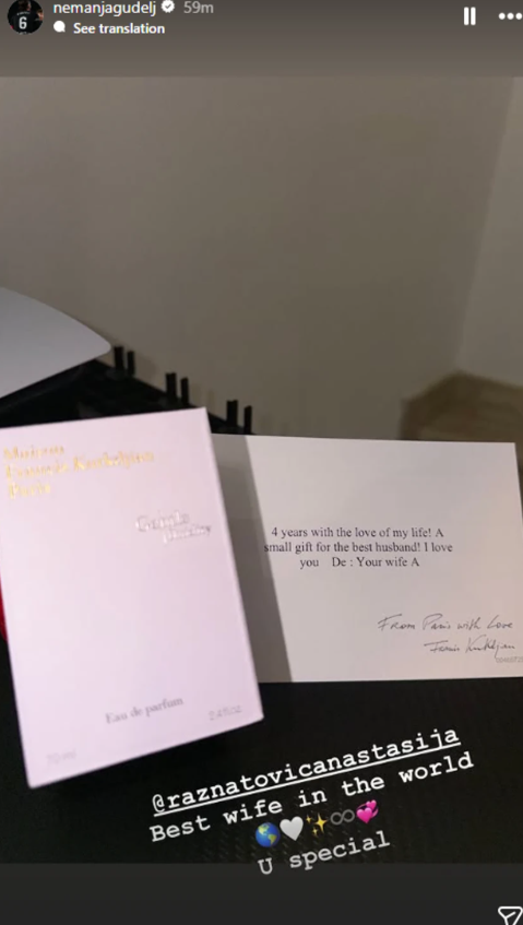 За да го прослават овој важен јубилеј на посебен начин, Анастасија на својот сопруг му подари еден од најскапите француски парфеми, придружен со многу лична посвета која го остави Немања без зборови.