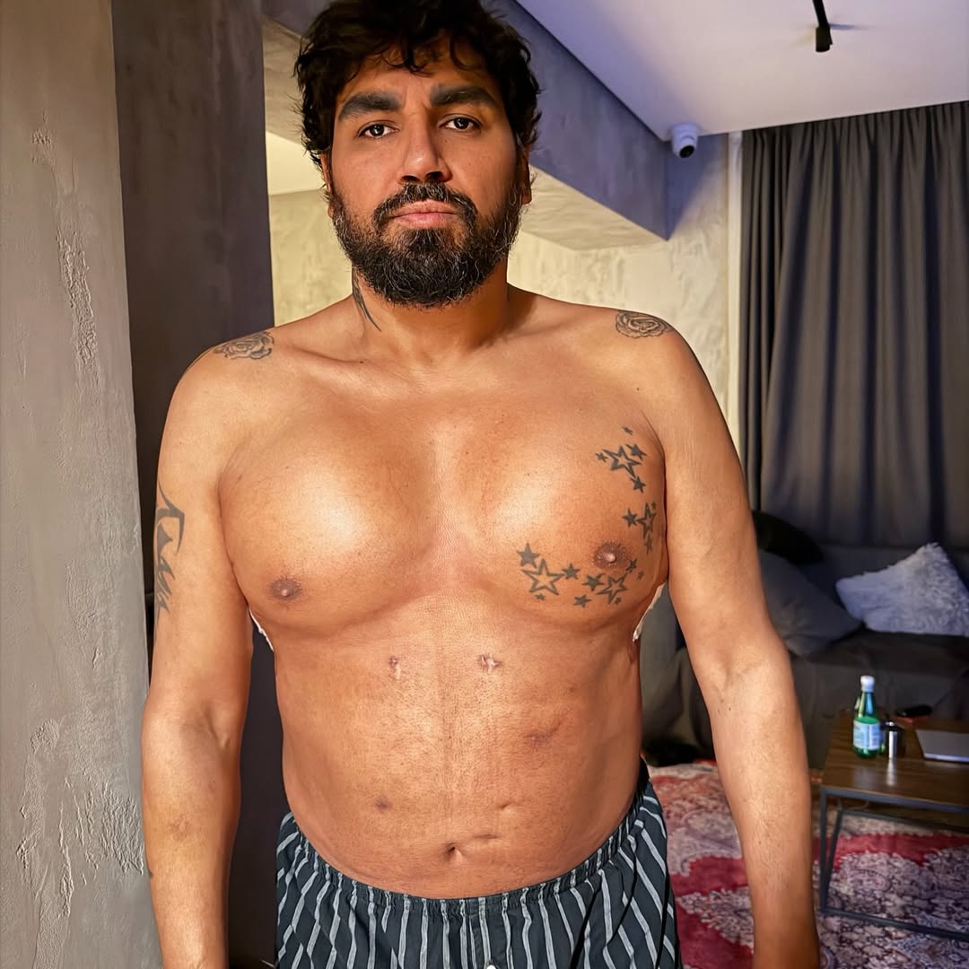 Пејачот објави фотографии без маица, на кои се гледа како поминала операцијата. Од страните на трупот сè уште се забележуваат конците и дреновите по хируршката интервенција.