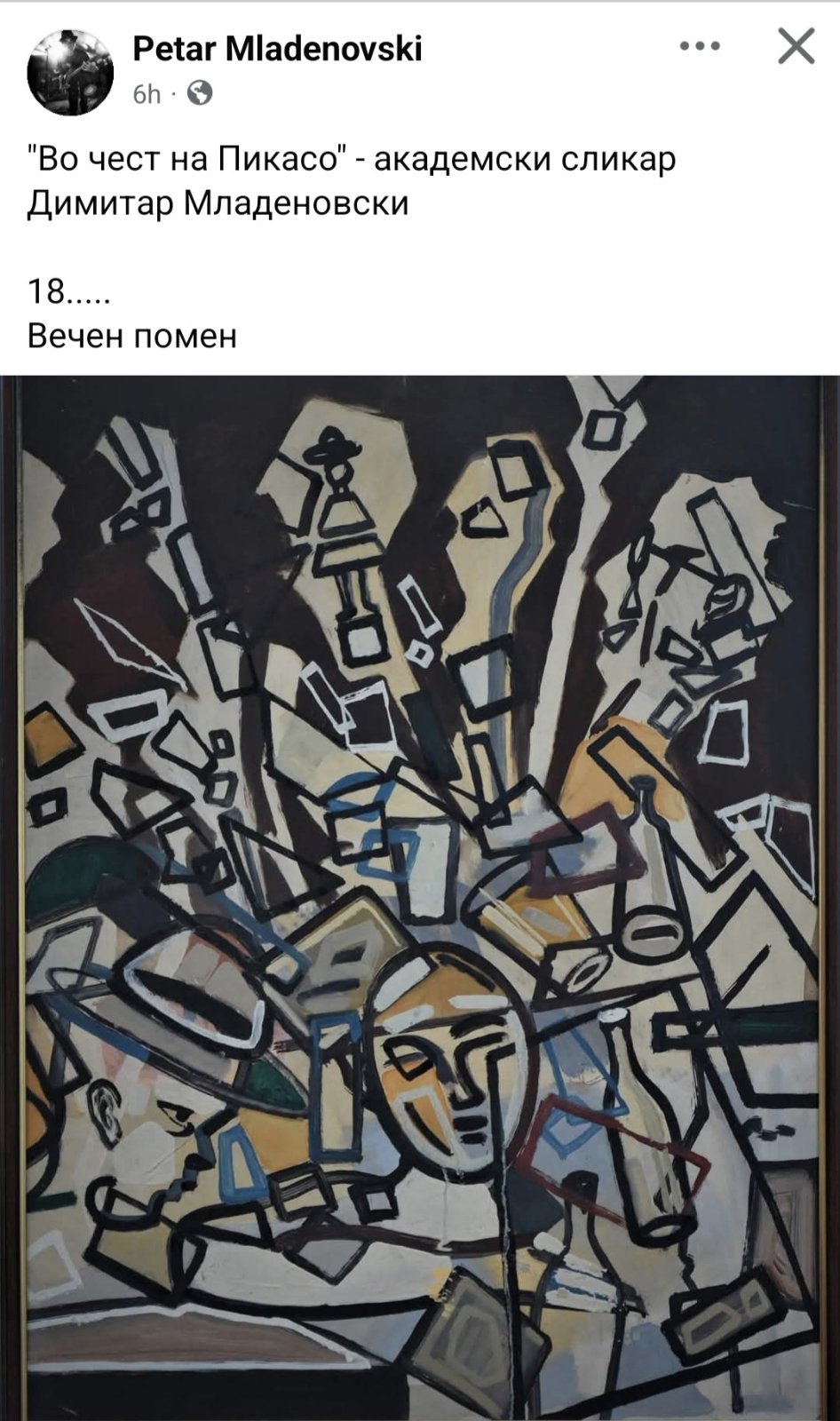 – Во чест на Пикасо – академски сликар Димитар Младеновски 18….. Вечен помен – напиша Петар Младеновски за својот брат, кој беше успешен уметник.