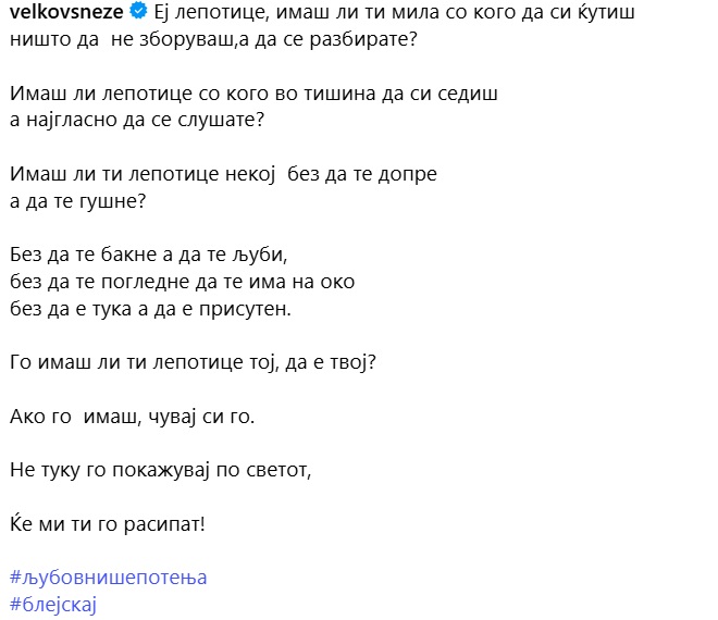 Снеже на Инстаграм објави една многу интересна приказна, која личи дека е инспирирана токму од нејзиниот сопруг и вели вака: