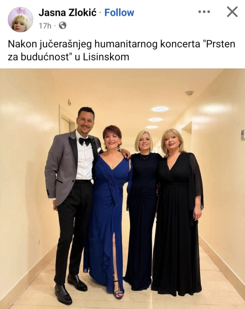 На новата слика која е објавена на нејзиниот Фејсбук профил, пејачката која има 70 години одлично изгледа, а е сликана на хуманитарен концерт во Загреб, заедно со колешката Зорица Конџа и со други колеги.