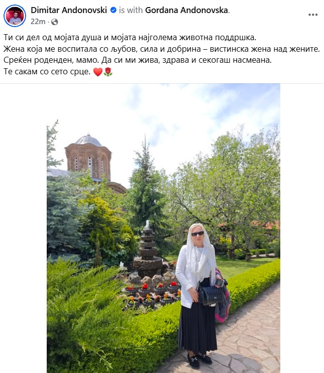 – Ти си дел од мојата душа и мојата најголема животна поддршка. Жена која ме воспитала со љубов, сила и добрина – вистинска жена над жените. Среќен роденден, мамо. Да си ми жива, здрава и секогаш насмеана. Те сакам со сето срце – напиша пејачот.