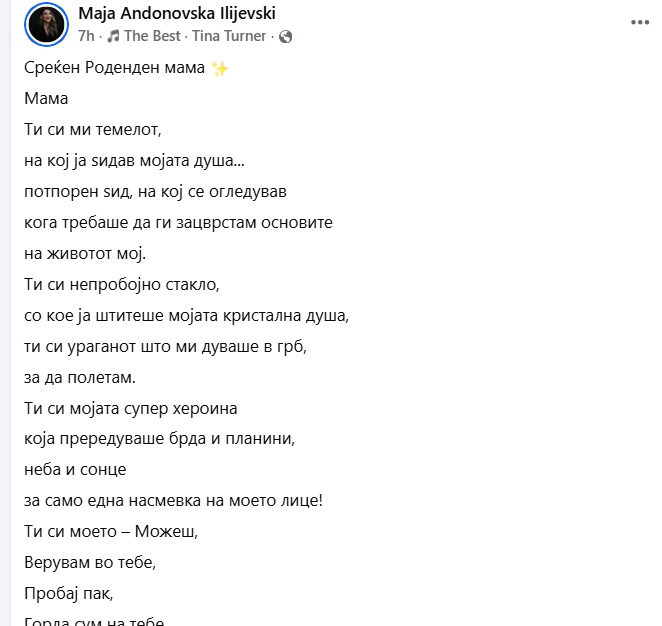 Ти си моето – Можеш, Верувам во тебе, Пробај пак, Горда сум на тебе. Ти си мојата сила, храброст, гласност, разум. И сè што сум јас денес, немаше да бидам, ако Бог не ме благословеше уште во утробата твоја да учам дека светот е поубаво место со жени од челик, а со стаклени очи како тебе – Мама – напиша Маја Андоновска-Илијевски.