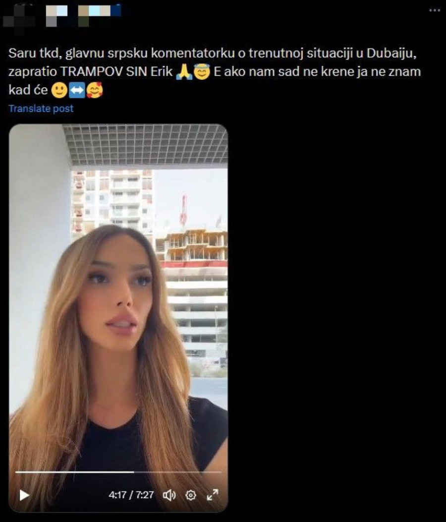 Српската инфлуенсерка Сара Дамјановиќ, позната како Сара ТКД, и натаму престојува во Дубаи заедно со сестра ѝ Ања, каде што состојбата останува напната. По евакуацијата од станот во кој биле сместени, двете се преселиле во хотел, а таа истакнува дека ситуацијата е сериозна, особено во текот на ноќните часови.