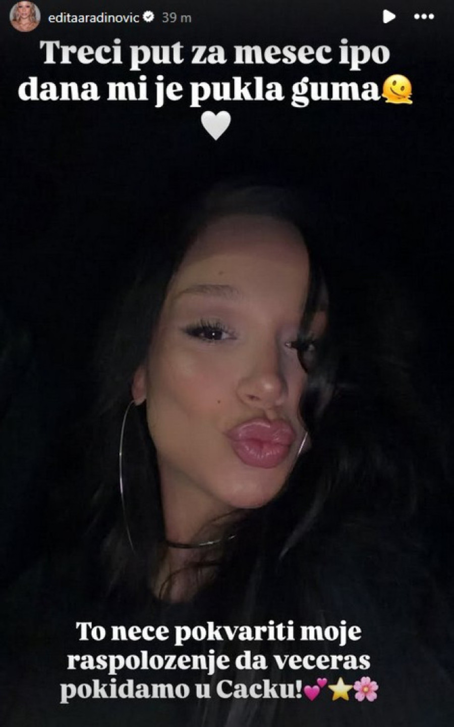 Да потсетиме, таа тргнала кон Чачак со автомобил, но за време на возењето ѝ пукнала гума. Едита преку Инстаграм откри дека ова е третпат за месец и пол да ѝ се случи истото.