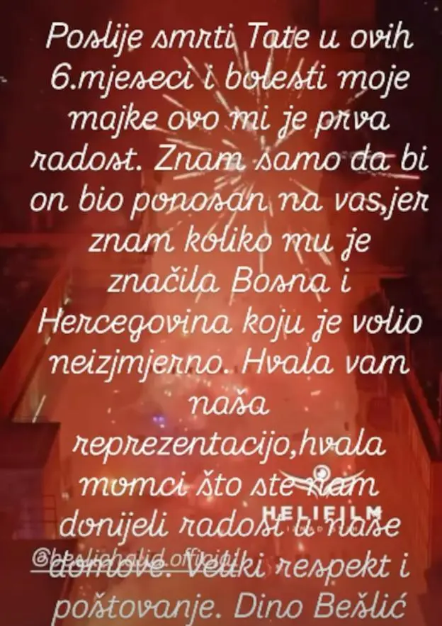 „По смртта на тато во овие шест месеци и болеста на мајка ми, ова ми е прва радост. Знам дека тој би бил горд на вас, затоа што знам колку му значеше Босна и Херцеговина, која неизмерно ја сакаше. Ви благодарам, наша репрезентацијо, благодарам момци што ни донесовте радост во домовите. Голема почит“, напиша тој на Инстаграм.