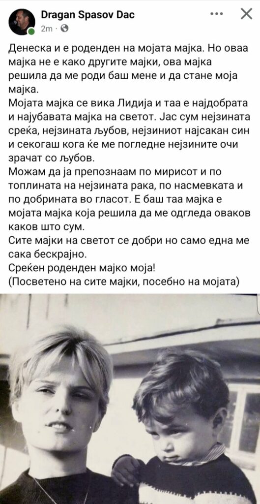 Актерот Драган Спасов- Дац објави емотивна приказна за неговата мајка, поетесата Лидија Лучко Јеремиќ со која е посебно поврзан. Поводот е 81. роденден на уваа убава дама, а актерот по тој повод на Фејсбук напиша: