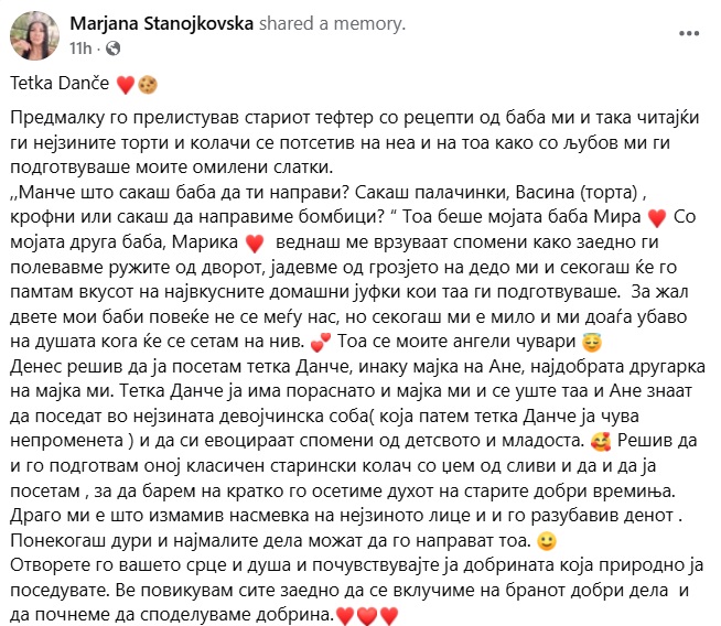 Отворете го вашето срце и душа и почувствувајте ја добрината која природно ја поседувате. Ве повикувам сите заедно да се вклучиме на бранот добри дела и да почнеме да споделуваме добрина“, е споменот кој го сподели Маријана на Фејсбук од пред 5 години.