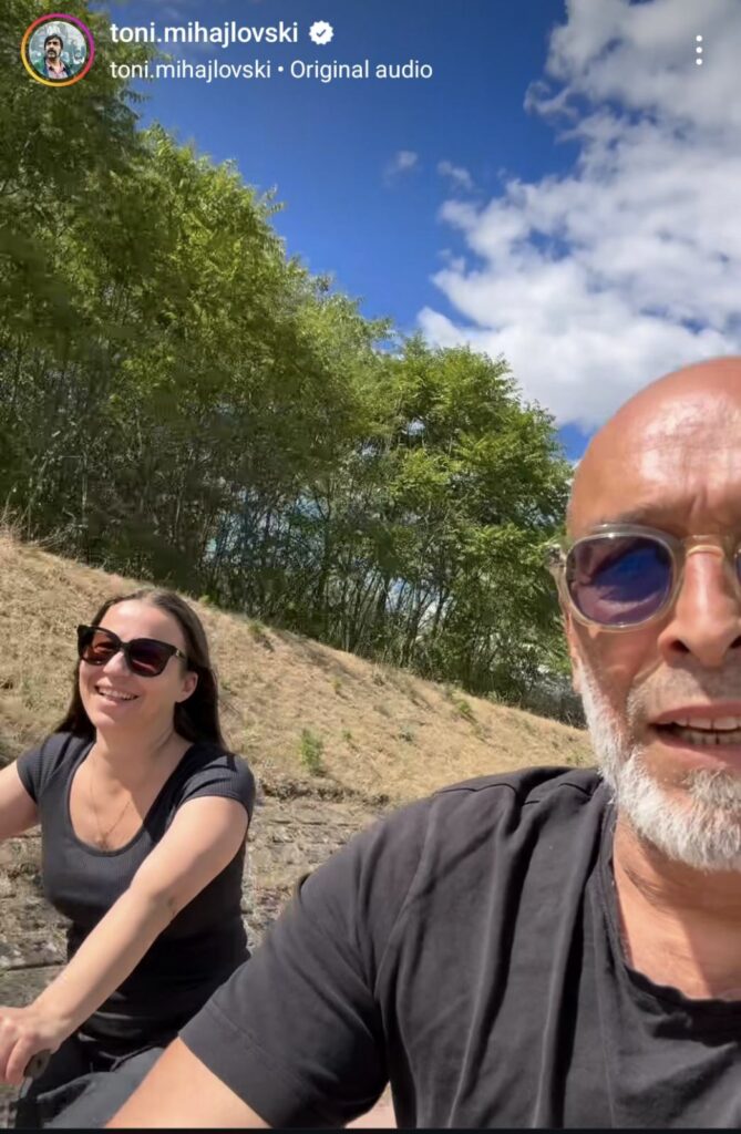 „Велат луѓето, возењето велосипед помага да се ослободите од стресот. Јас решив да излеам, да се повозам малце да се ослободам од стресот, кога тоа и стресот решил да вози точак со мене. Ете ти, па вие возете пак точаци“, рече Тони во видеото, на што неговата сопруга слатко се изнасмеа.