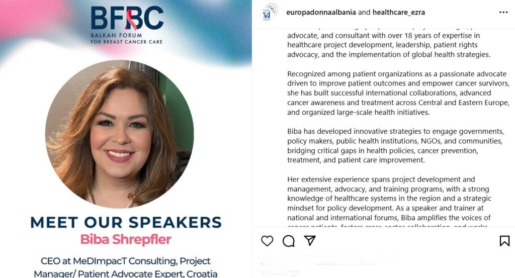 „Како говорник и тренер на национални и меѓународни форуми, Биба ги засилува гласовите на пациентите со рак, поттикнува меѓусекторска соработка и неуморно работи за зајакнување на здравствените системи и застапувањето на пациентите со главен фокус на Централна и Источна Европа и Балканот“, пишува на објавата.