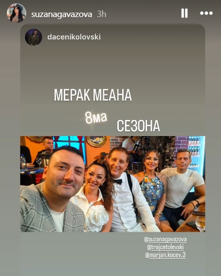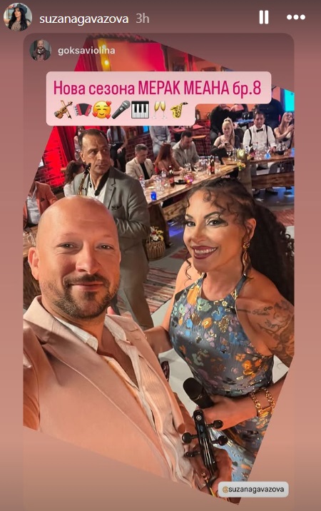 Една слика но и видеа објави Сузана Гавазова, на кои се гледа колку е весела, танцува со мини тесен фустан, а до неа а Гокса виолина или Горјан Стојановски, кој свири виолина и е постојан член на екипата на „Мерак меана“.