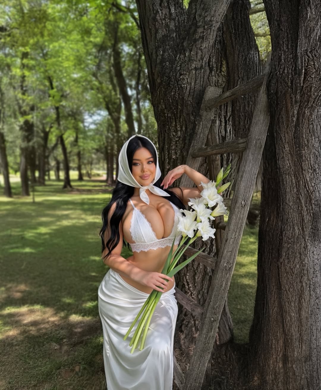 На најновите фотографии Клаудија позира во природа, опкружена со зеленило и дрвја, потпрена на дрвена скала.