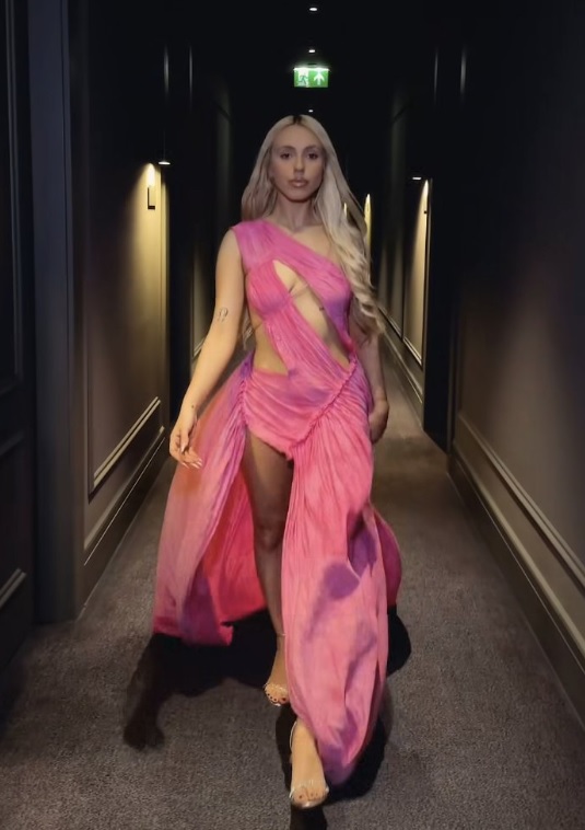 Самиот фустан е вистинска модна провокација, составен од длабоки исечоци и лелеав материјал. Со овој модел, пејачката покажа дека е во врвна форма, а високиот шлиц и асиметричниот горен дел придонесоа за исклучително атрактивен и модерен изглед. Нејзината долга руса коса и минималната шминка дополнително го нагласија нејзиниот сексапил.