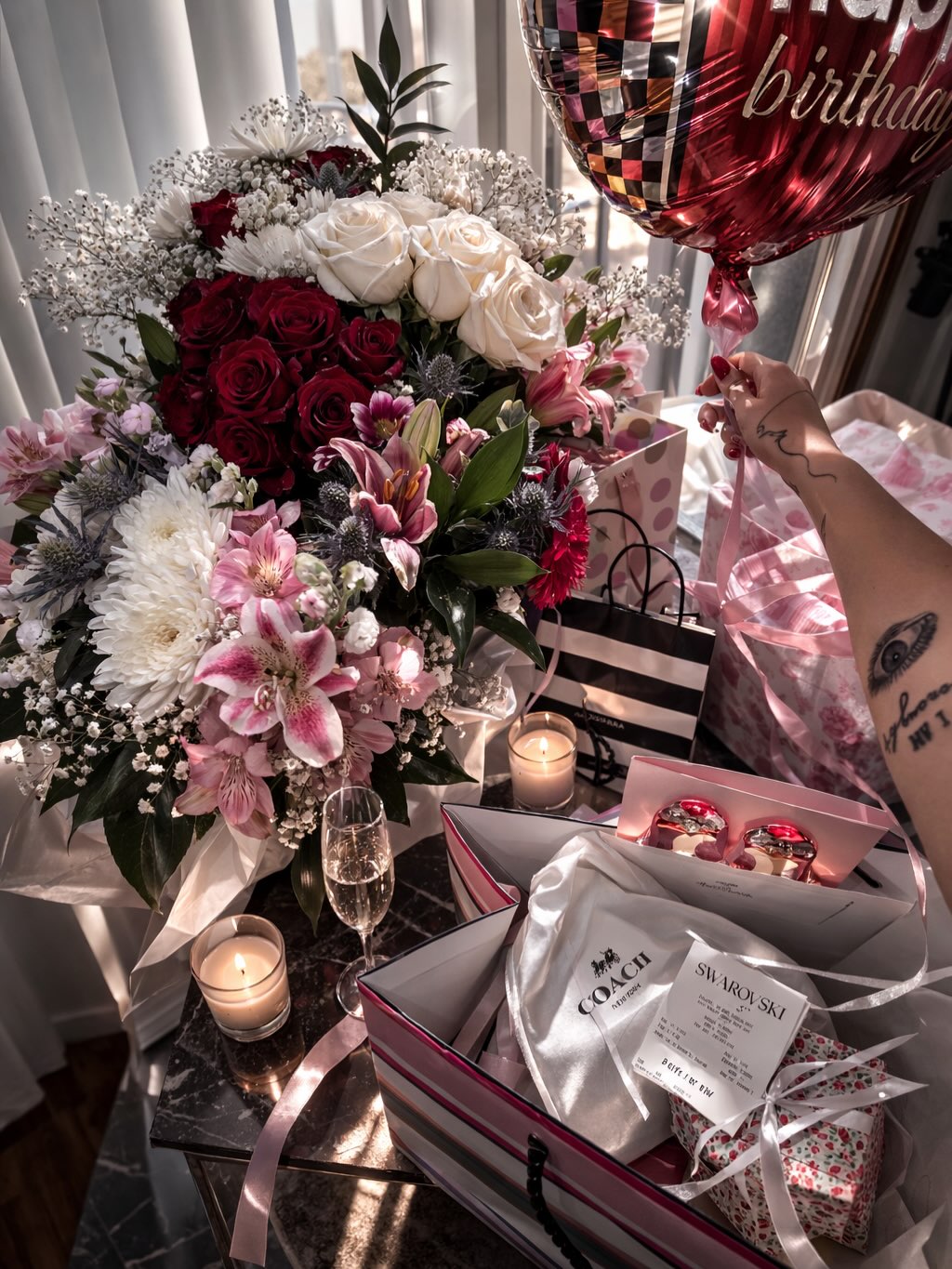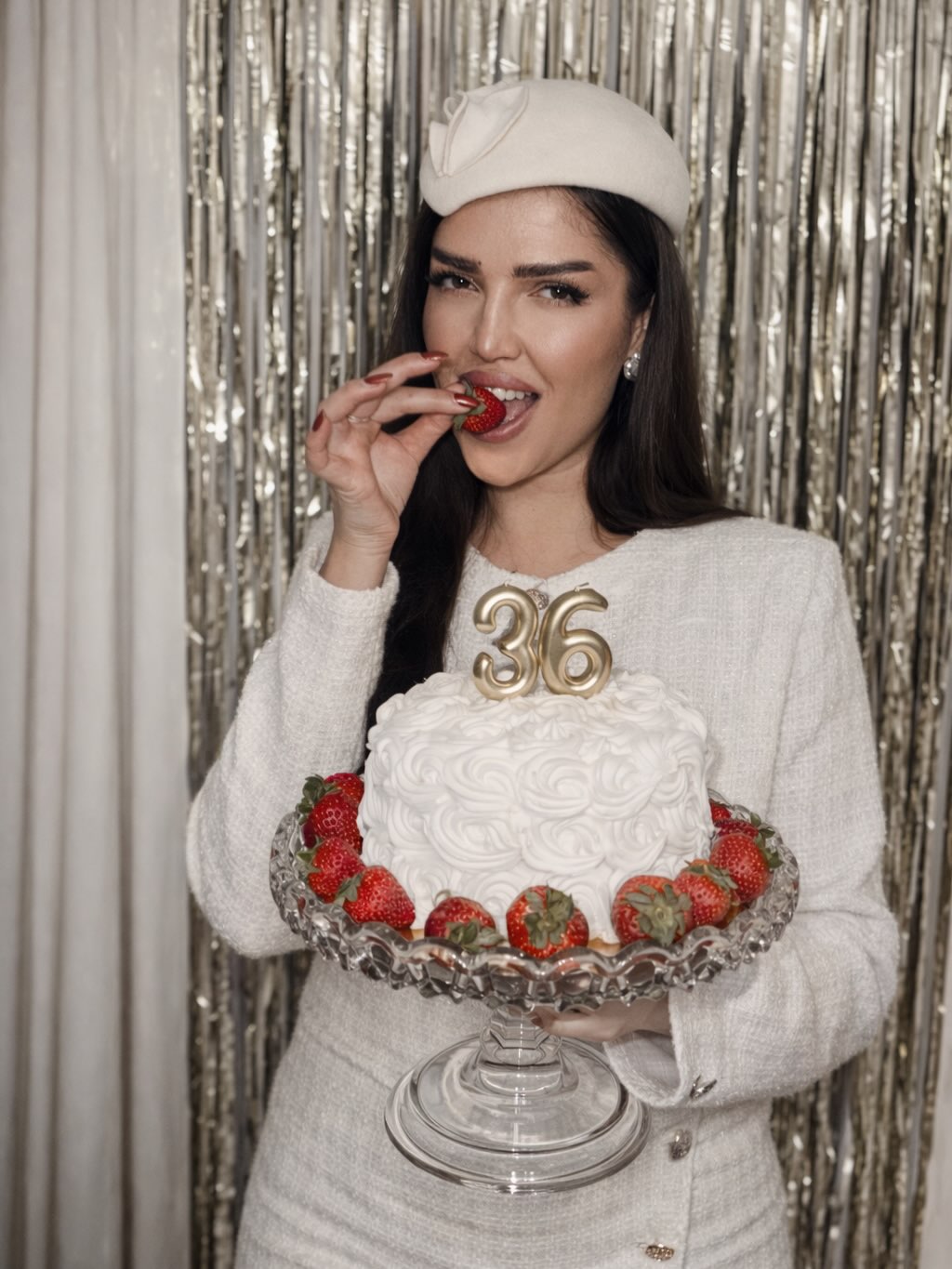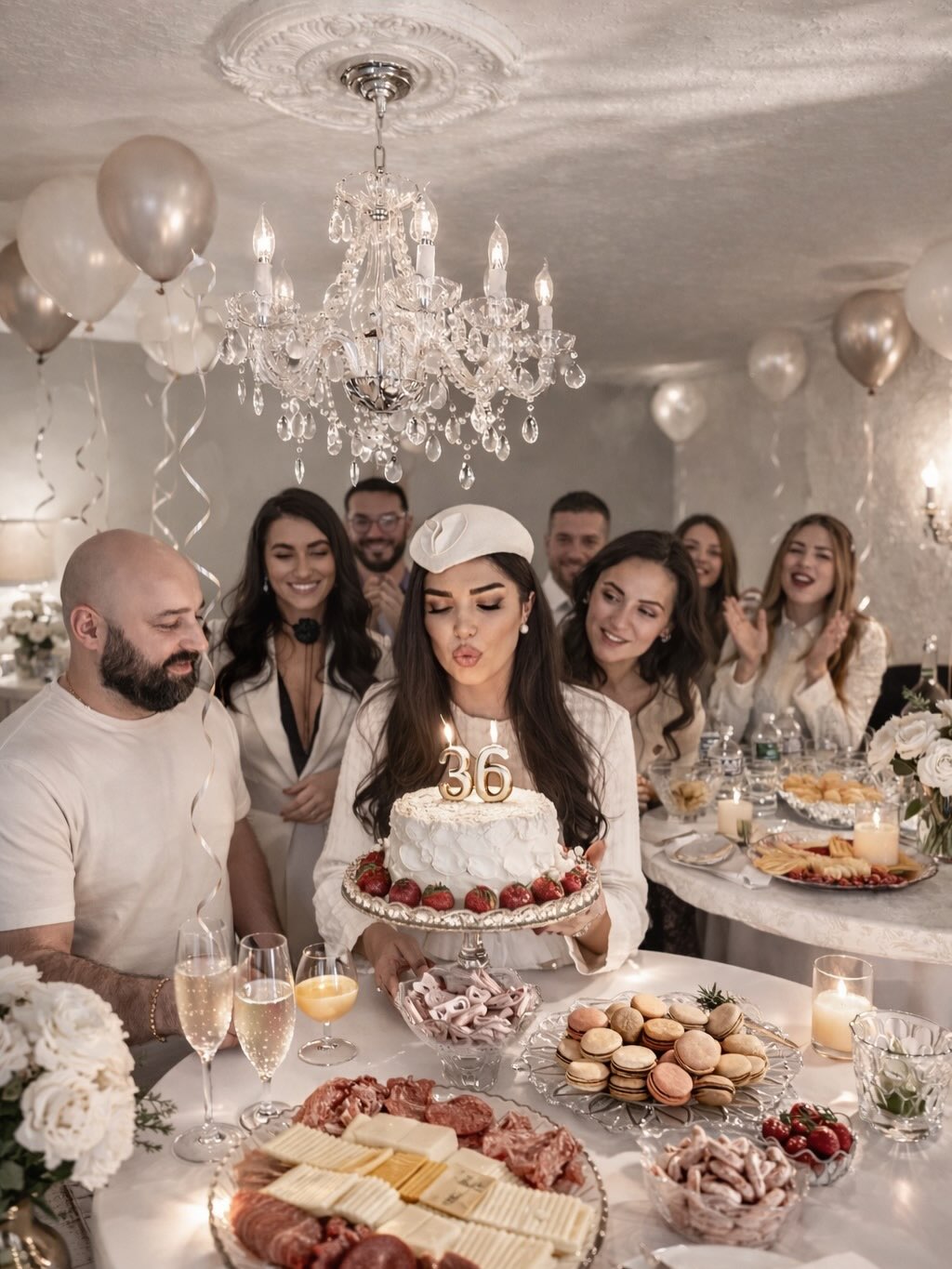 Прославата била во знак на белата боја – од декорацијата до дрес-кодот. Просторот бил украсен со бели балони и минималистички детали, додека трпезата изобилувала со внимателно аранжирани специјалитети, торта со јагоди и златни свеќички.