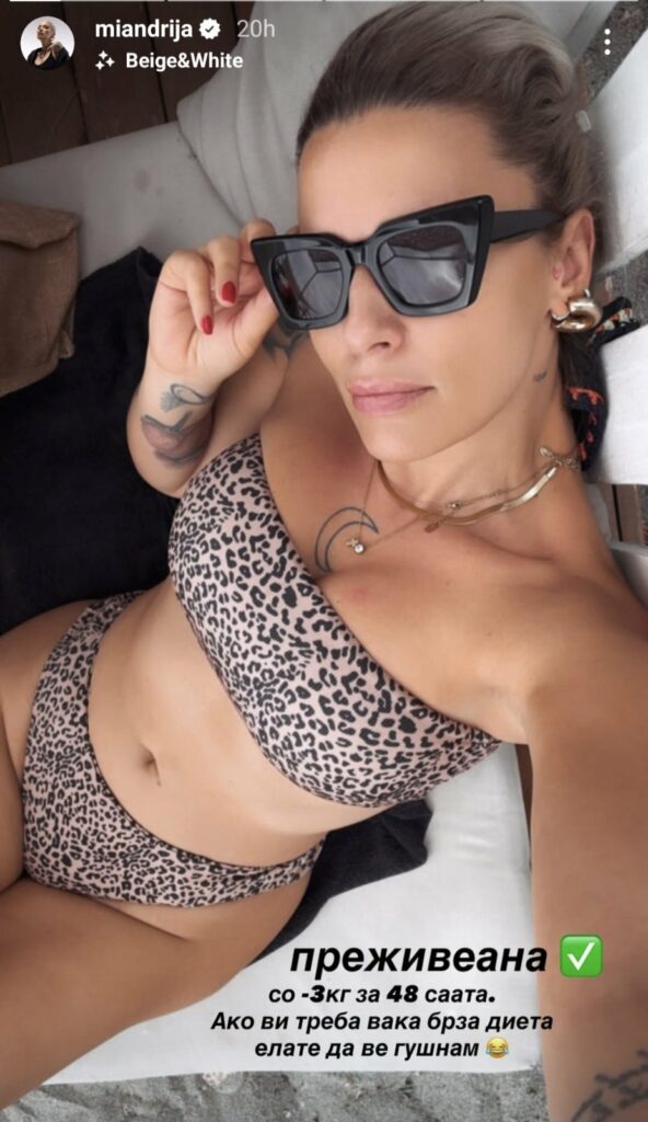 Миа претходно има кажано дека се придржува кон „фастинг“ диетата, а сега на стори на Инстаграм објави дека ослабела три килограми и воопшто не јадела два дена. „Преживеана, со минус 3 килограми за 48 часа. Ако ви треба вака брза диета, елате да ве гушнам“, напиша инфлуенсерката која изгледа одлично во бикини.