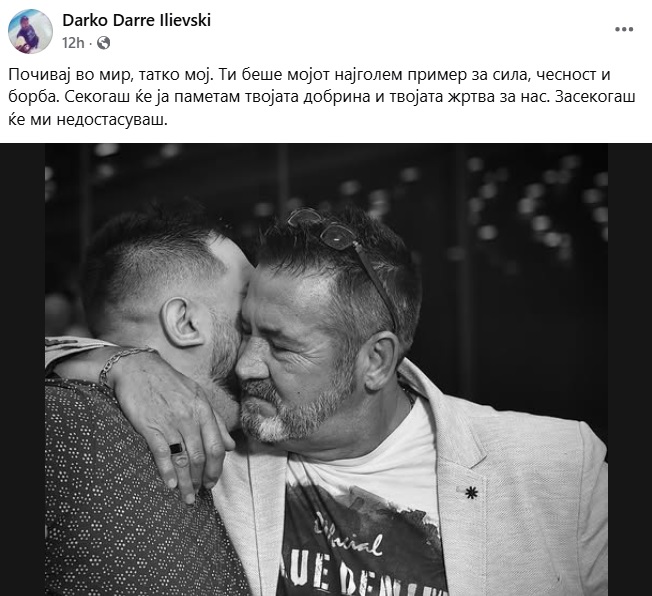 Дарко Илиевски, сношти сподели една тажна објава на социјалните мрежи, тој го загуби човекот кој беше неговата најголема поддршка, неговиот татко.