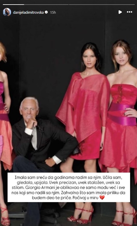 Водителката и модел Данијела Димитровска упати емотивен поздрав до големиот моден визионер Џорџо Армани, кој почина на 91-годишна возраст и чие име засекогаш ќе остане во историјата на модата.