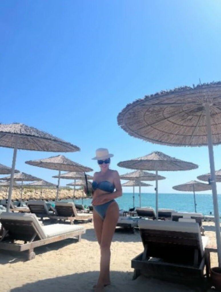 Потоа позираше во сино бикини и покажа дека иако влезе во седмата деценија, успева да одржи витка линија.