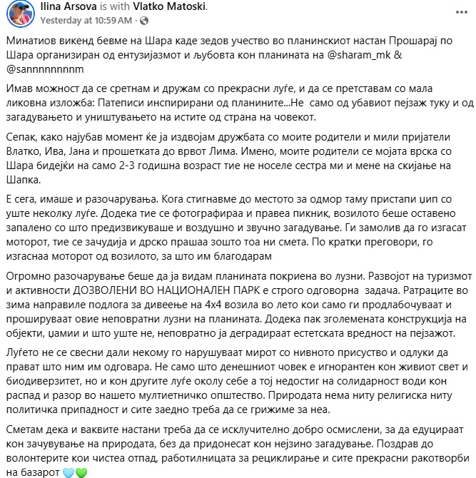 Но, една непријатна случка доживеала нашата позната планинарка на Шара, која целосно ја раскажа на својот фејсбук-профил.