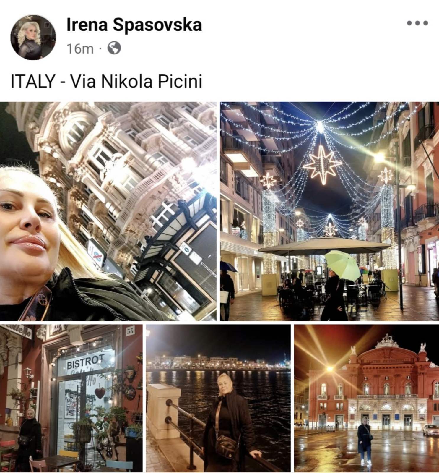 Ирена е во Италија, поточно во Бари, од каде што објави убави фотографии од ноќната прошетка низ овој град кои поради дождот се уште поромантични. Спасовска не откри со кого е во Бари.