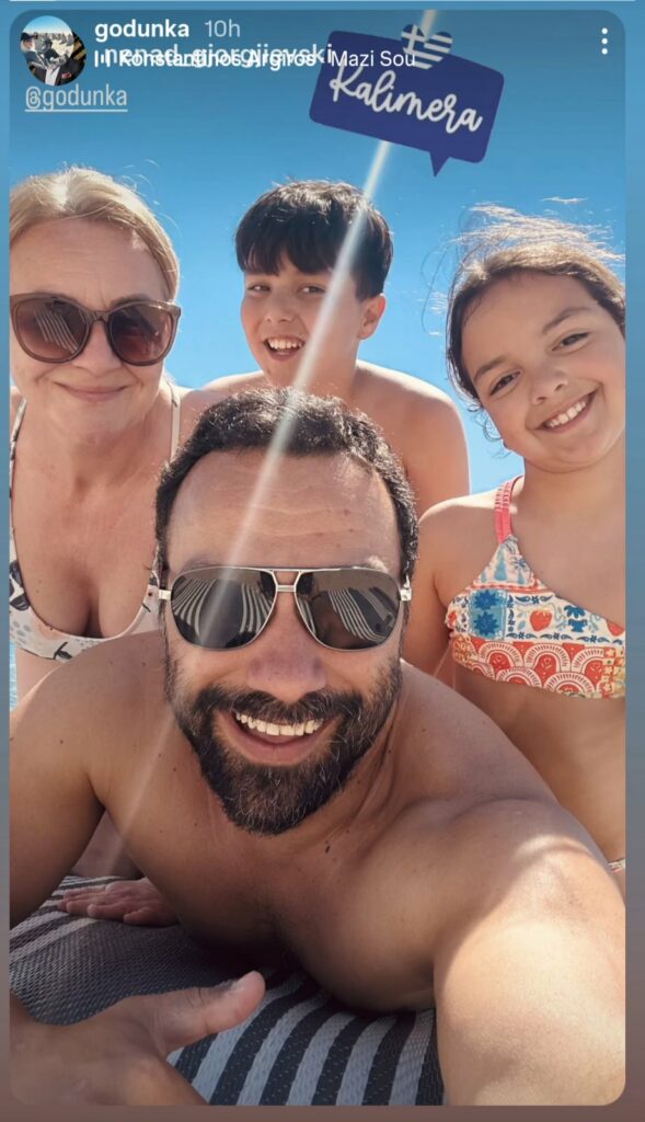 На друга фотографија, семејството позира заедно под силното сонце, со напис „Kalimera“. Опуштената атмосфера и блискоста меѓу нив уште еднаш покажуваат дека за Ѓоргиевски, покрај професионалните ангажмани, семејството е на прво место.