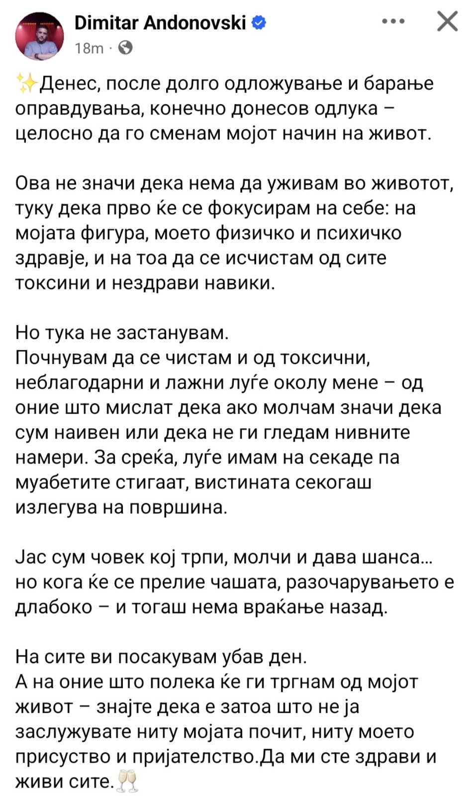 Голема животна промена му се случи на пејачот Димитар Андоновски, за која тој ги извести своите следбеници на Фејсбук. Пејачот од Битола си ја отвори душата во новата објава.