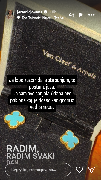 Српската водителка Јована Јеремиќ се пофали на социјалните мрежи со скапиот подарок што го доби. Водителката не сакаше да открие од кого е, но истакна дека сонувала за него претходните седум дена и дека пристигнал како „грмо од ведро небо“.