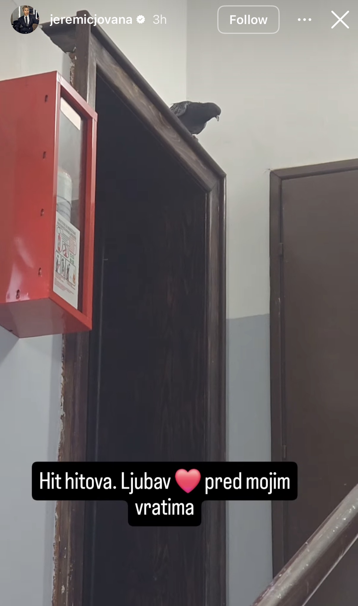 Имено, пред самата врата од нејзиниот стан се појавил гулаб кој влегол во зградата и слетал токму на влезот пред нејзиниот стан.