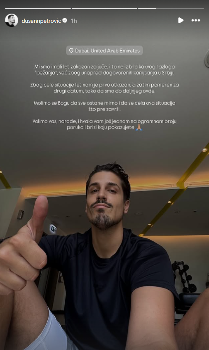 „Ние имавме закажан лет за вчера и тоа не од каква било причина, туку поради однапред договорени кампањи во Србија. Поради целата ситуација, нашиот лет прво беше откажан, а потоа проверен за друг датум, па затоа сме тука до понатамошно известување. Му се молиме на Бога сè да остане мирно и целата ситуација да заврши што е можно побрзо. Ве сакам народе и ви благодарам уште еднаш за огромниот број пораки и грижата што ја покажувате“, напишал Душан Петровиќ.