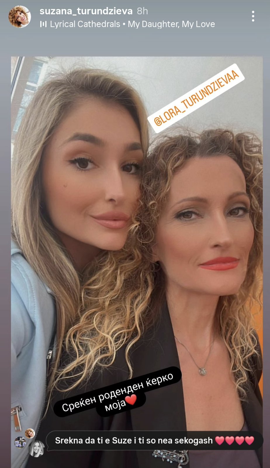 Сликата е по повод роденденот на Лора а до неа Сузана напишала: „Среќен роденден ќерко моја“. На сликата е означен и профилот на Лора на кој може да се забележи дека таа го носи презимето на мајка си, Турунџиева.