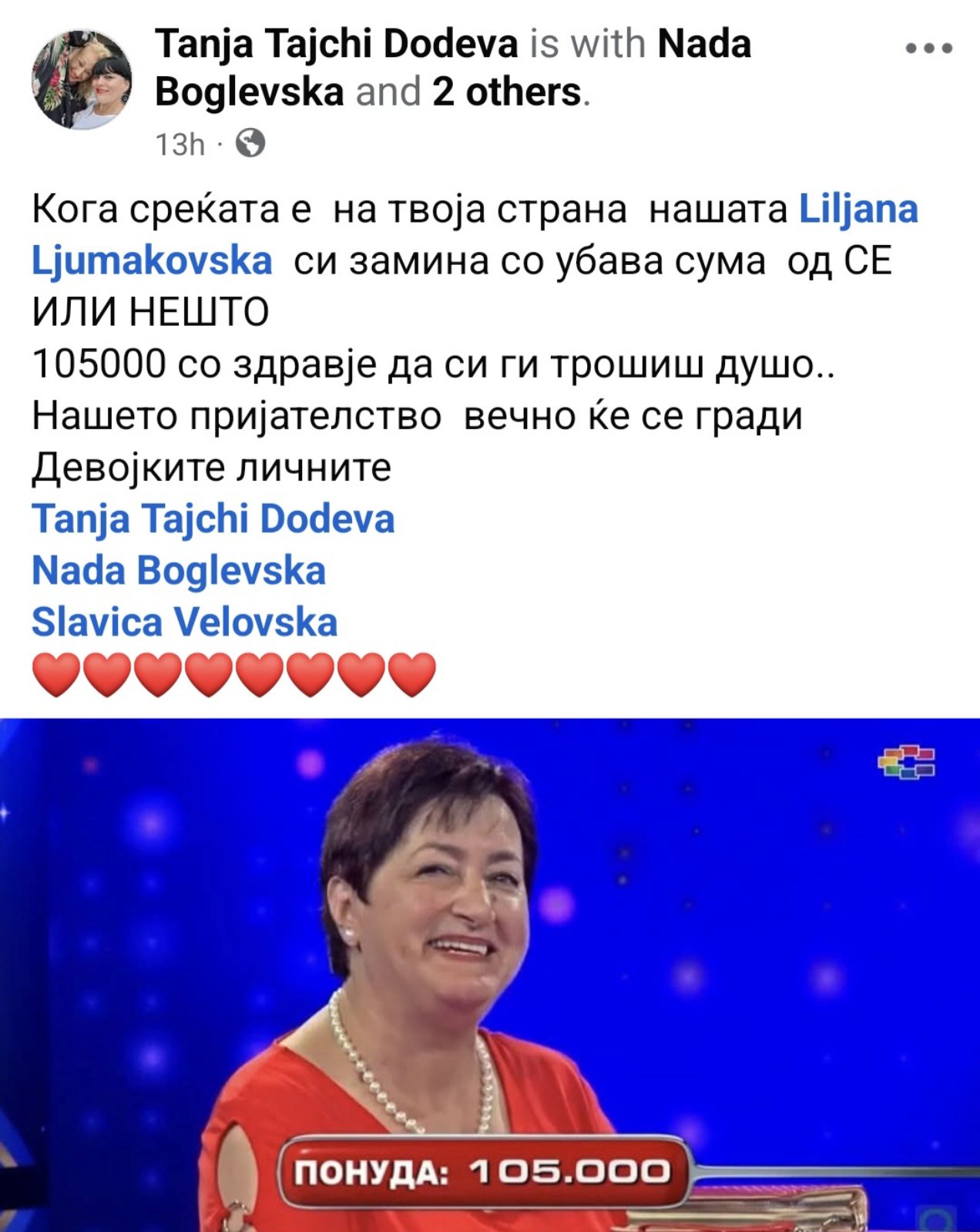 – Кога среќата е на твоја страна нашата Љиљана Љумаковска си замина со убава сума од „Сè или нешто“. 105.000 со здравје да си ги трошиш душо. Нашето пријателство вечно ќе се гради – објави пријателката на Љиљана, Тања Тајчи Додева.