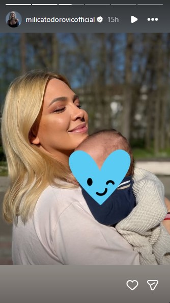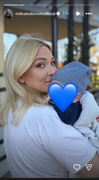 Милица не се одвојува од синот Богдан, а сега со следбениците сподели и прв заеднички момент. На социјалната мрежа Инстаграм објави фотографија на која нежно го држи во прегратка. Малиот Богдан беше облечен во темносин костум и капче со линии, додека мирно уживаше потпрен на рамото на мајка си.