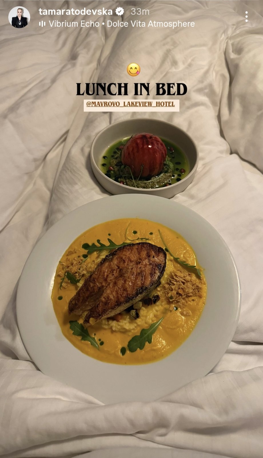 Пејајачката објави фотографија од Маврово каде што уживаше со него и со своите деца, а една фотографија остави најголем впечаток. На неа Тамара покажала дека добила ручек во кревет.