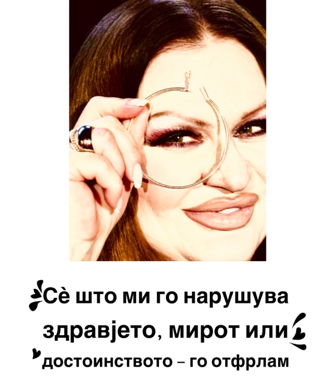 – Не се жртвувам за туѓ мир. Не спасувам никого. Вредностите ми се фиксни. Сѐ што ми ги нарушува здравјето, мирот и достоинството-го отфрлам – објави Весна Бејби.