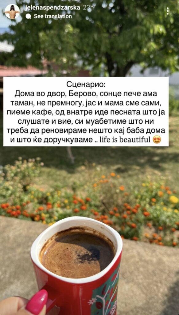 На една од сликите, додека го пие првото утринско кафе во градината со цвеќе, Спенџарска напиша: „Сценарио: Дома, во двор, Берово, сонце пече ама таман, не премногу, јас и мама сме сами, пиеме кафе..