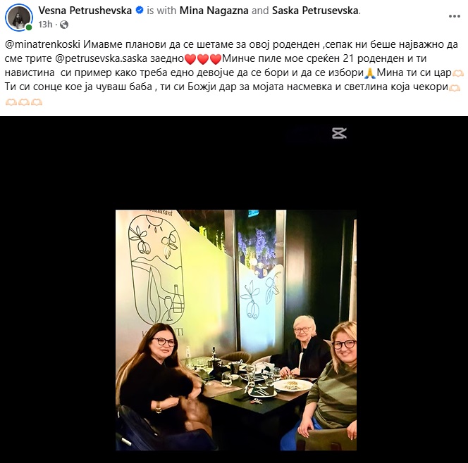 – Имавме планови да се шетаме за овој роденден, сепак ни беше најважно да сме трите, со Сашка Петрушевска заедно. Минче пиле мое среќен 21 роденден и ти навистина си пример како треба едно девојче да се бори и да се избори.