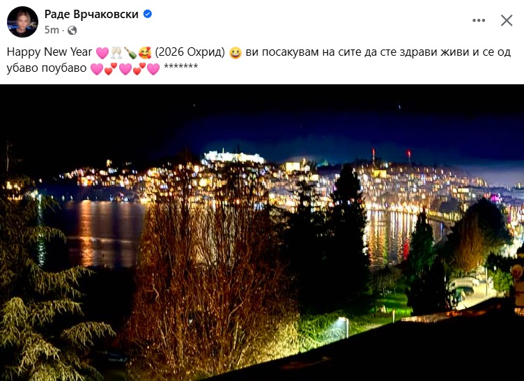 -Happy New Year. (2026 Охрид). Ви посакувам на сите да сте здрави живи и се од убаво поубаво- напиша раперот до оваа романтична слика од Охрид ноќе.