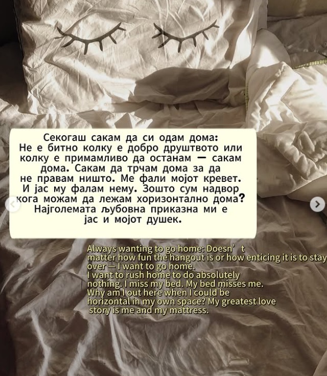 Секогаш сакам да си одам дома. Не е битно колку е добро друштвото или колку е примамливо да останам – сакам дома. Ми фали мојот кревет. И јас му фалам нему. Најголема љубовна приказна ми е јас и мојот душек.