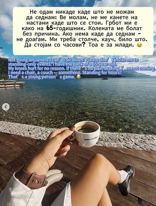 – Не одам никаде каде што не можам да седнам. Ве молам, не ме канете на настани каде што се стои. Грбот ми е како на 65-годишник. Колената ме болат без причина.