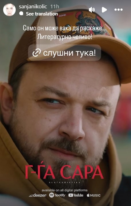 Таа ја објави новата песна на Слаткар, „Ѓ-ѓа Сара“ која е всушност продолжение на приказната од неговиот стар хит „Сара“, и напиша: „Само он може вака да раскаже. Литературно четиво!“ Слаткаристика инаку пред два дена го објави новиот албум со пет песни, на кој му гостуваат Калиопи, Пајак и раперот од Америка Оби Трајс.