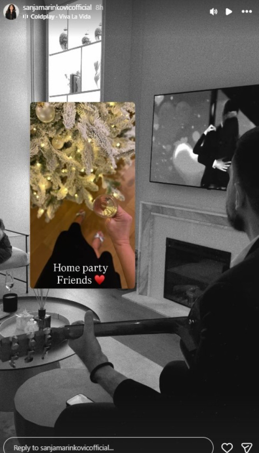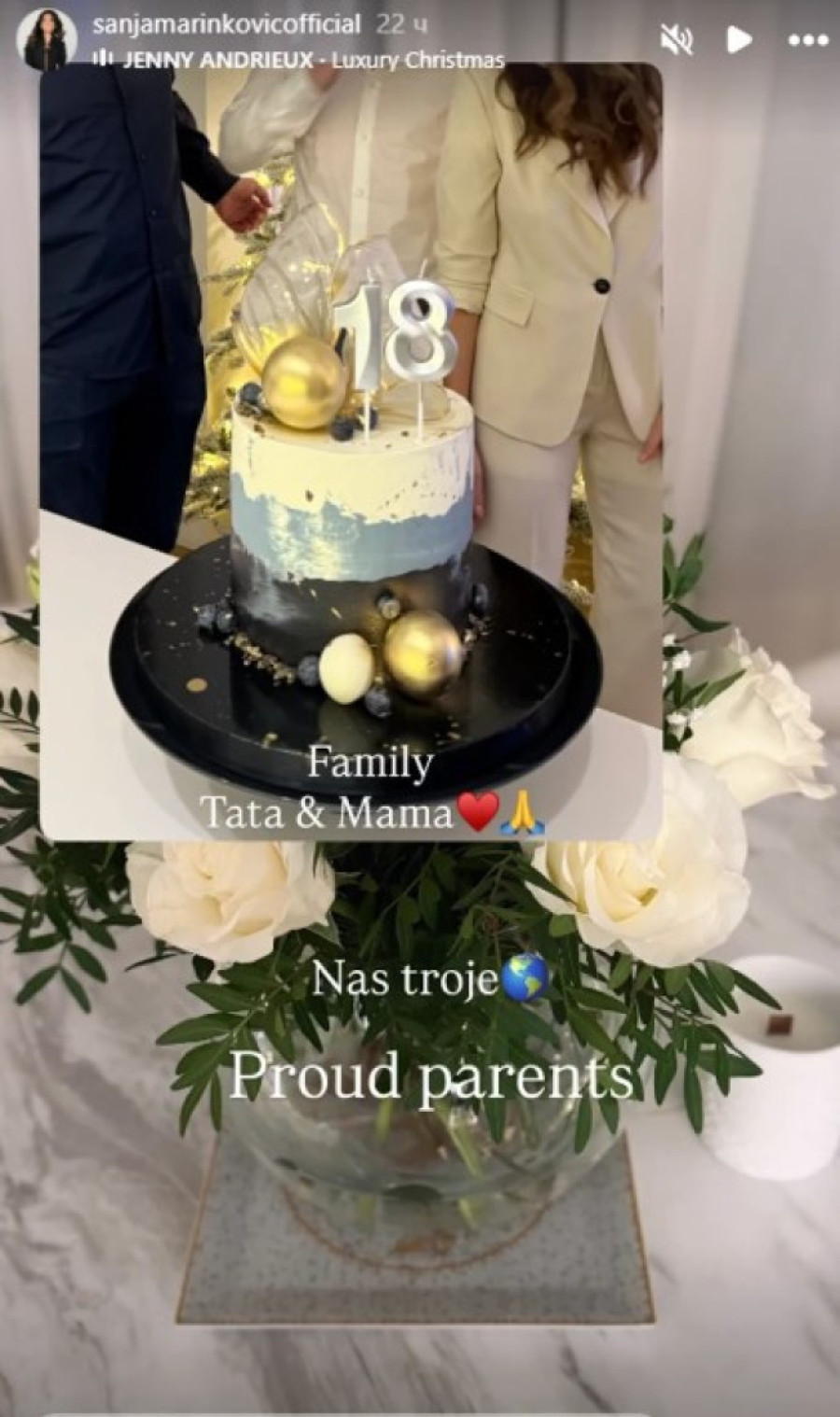 На една од фотографиите, Страхиња позираше покрај тортата со двајцата родители – Сања и Александар. Иако ги сокри нивните лица, водителката во описот напиша: „Мама и тато. Семејство. Гордите родители. Ние тројца“, додавајќи емотикон од планета, со што порача дека тие се нејзиниот цел свет.