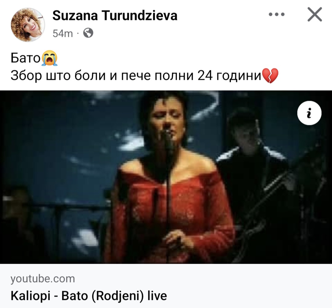 Денеска, кога се навршуваат 24 години од загубата на брат ѝ, Сузана на Фејсбук ја сподели песната „Бато“ од Калиопи и напиша: „Бато. Збор што боли и пече полни 24 години“.